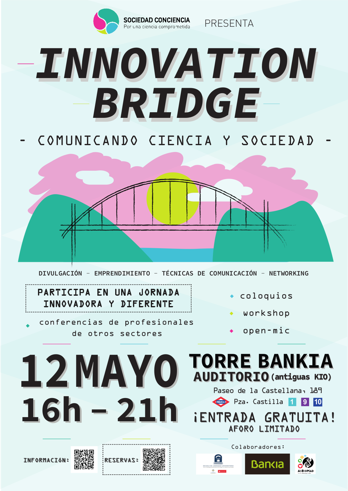 ¿Qué es? Nuestra propuesta es Innovation Bridge: Comunicando ciencia y sociedad, una jornada que girará en torno a la desconexión existente entre ciencia y sociedad en España y en cómo abordar el problema. El evento combina elementos de congreso y taller, y pretende constituir un foro de encuentro entre el colectivo científico-tecnológico, incluyendo emprendedores e innovadores, profesionales de otros campos y el sector universitario.
